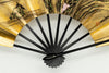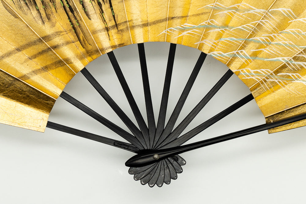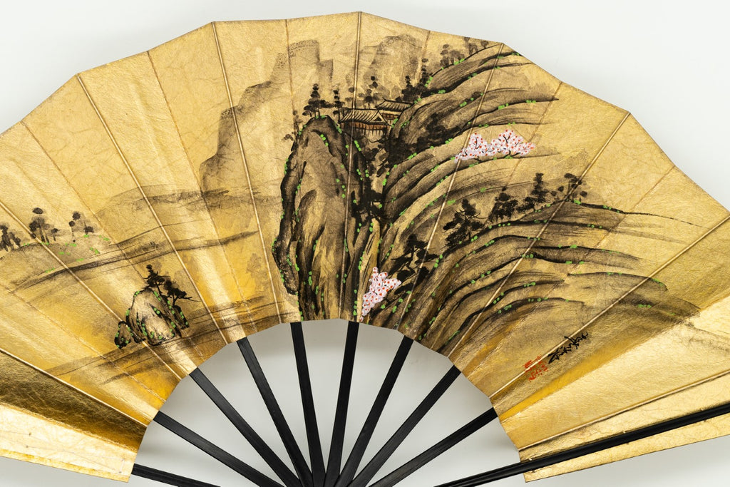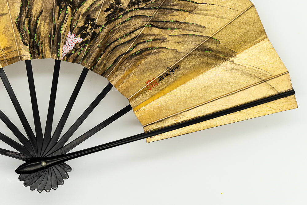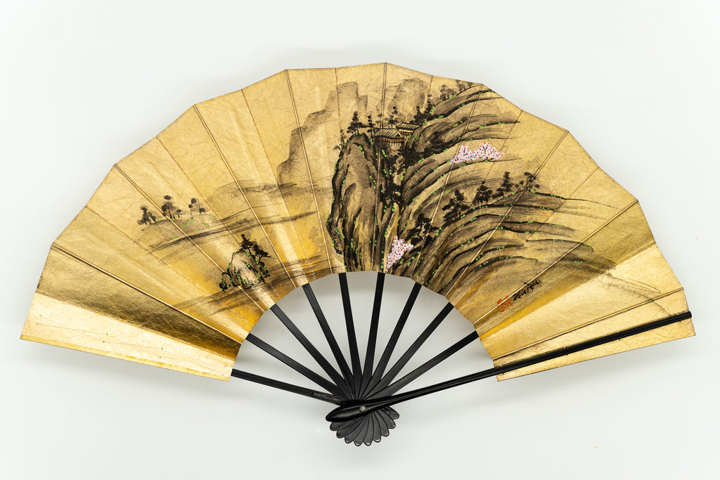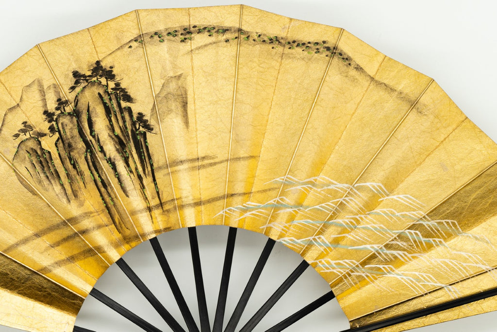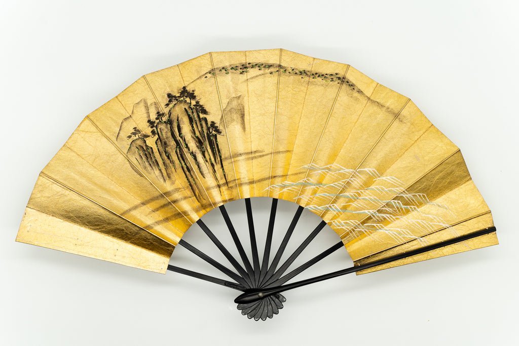 【ビンテージ品】金箔を手で揉みこんで扇面に箔押した金もみ地に墨絵の山水画が手描きで描かれています。表と裏が違うデザインになっており、両面でお楽しみいただけます。