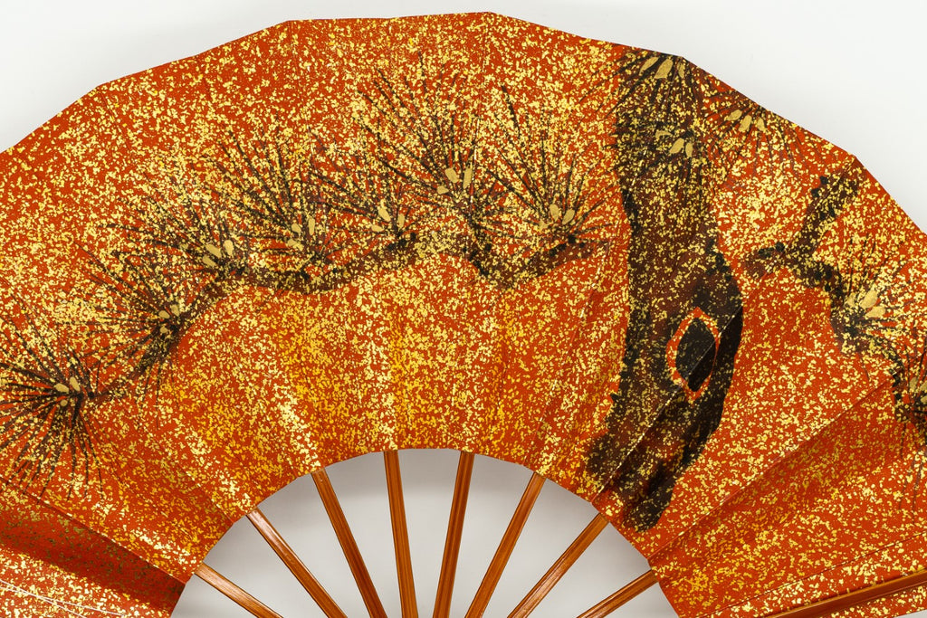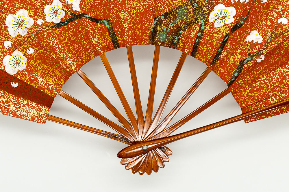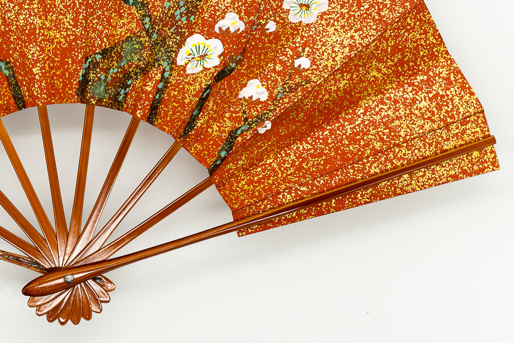 一面金砂子の地紙に松、もう片面には白梅が手描きで描かれています。金砂子と墨絵の松の調和が美しく、白梅は花びらが浮き立つように表現されています。春慶塗りの骨が上品にマッチして扇面のデザインを引き立たせています。