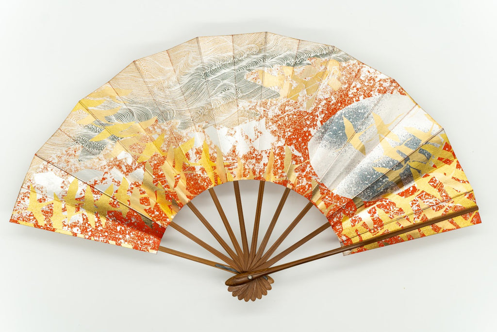 【ビンテージ品】朱色地に存在感のある月と波、金銀箔細工で群れをなして舞飛ぶ鶴を表現した非常に美しく手の込んだ逸品です。日本では鶴は生命力と長寿の象徴、つがいと一生添い遂げることから夫婦円満の象徴でもあります。大変お目出度い吉祥文様として古くから愛され親しまれており、晴れ着などにも多く使われています。大き目のサイズで格式高く厳かな存在感があります。