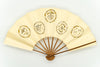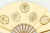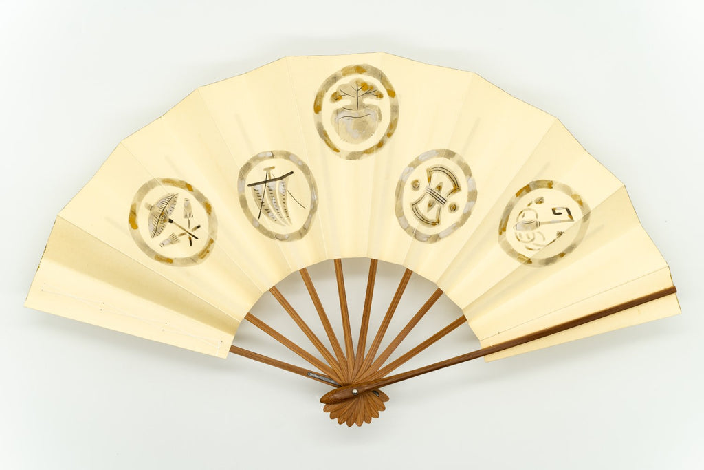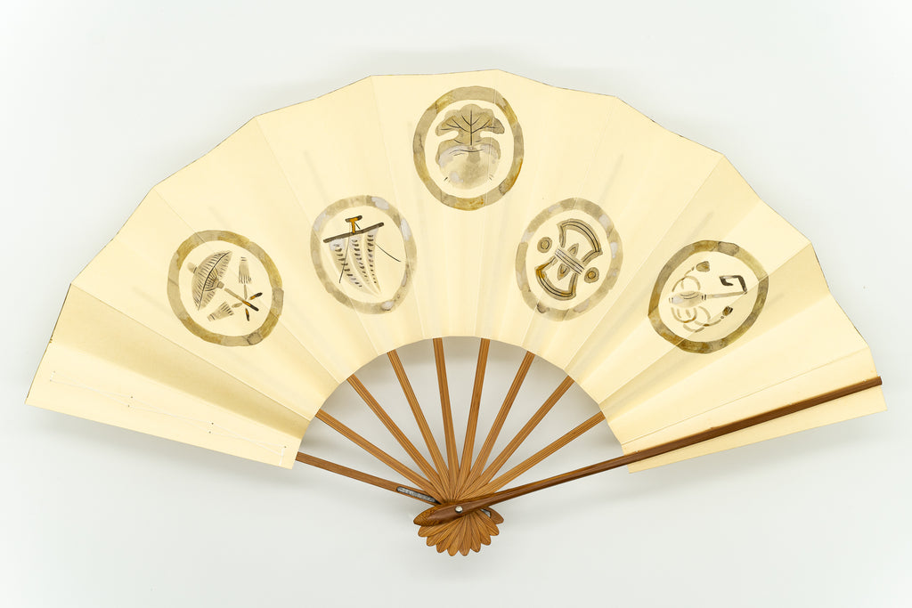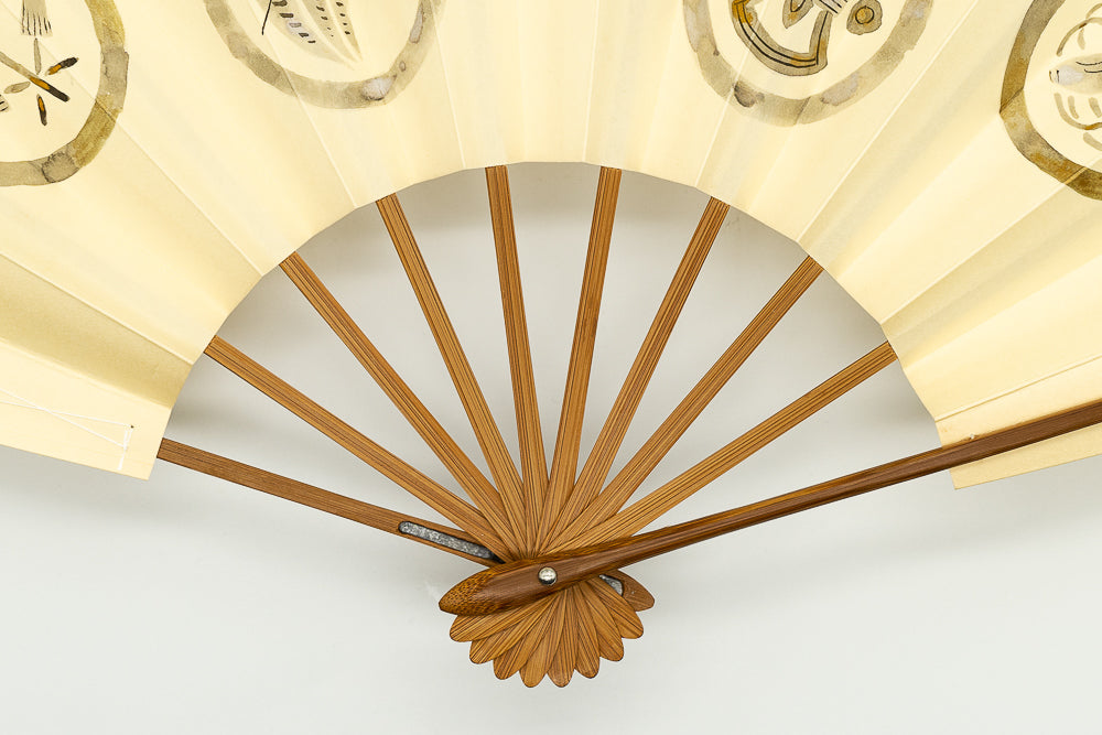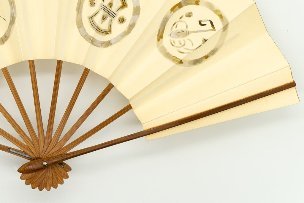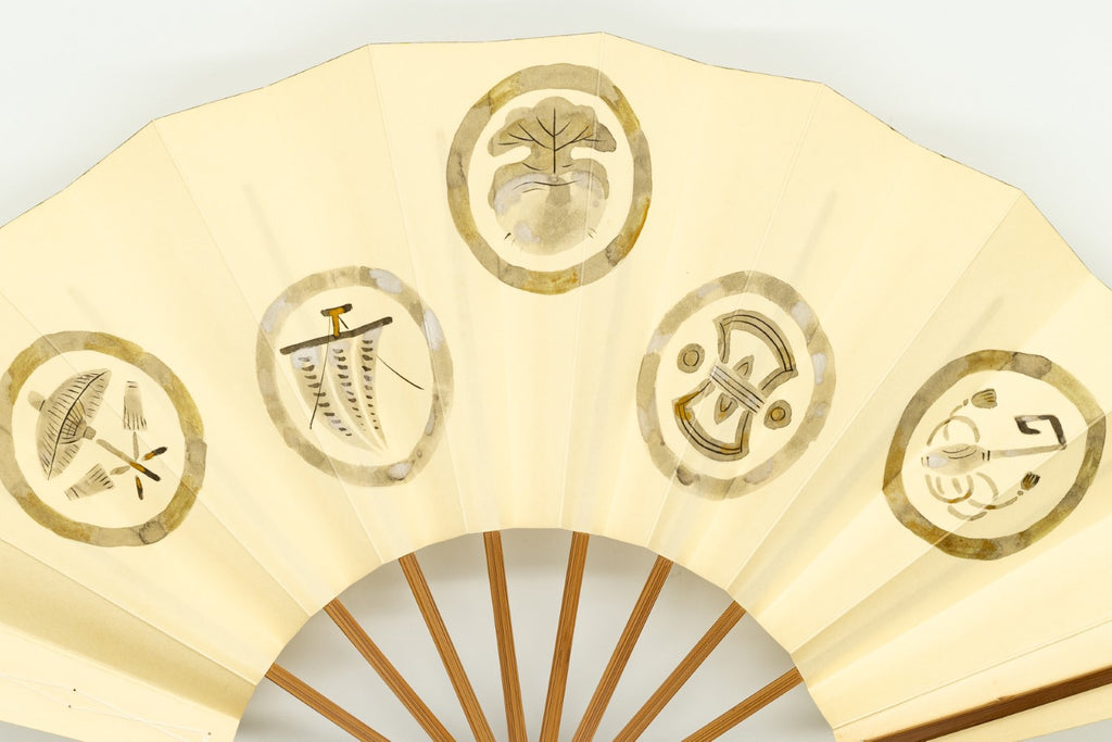 【ビンテージ品】鳥の子地に墨絵の宝づくしが手描きで描かれています。宝尽くしとは、仏教の八宝(8つの宝物)や雑八宝(ざつはっぽう)に由来しています。打出の小槌、隠れ蓑、隠れ傘、丁字、分銅などの様々な宝物のモチーフを並べた宝尽くし文様は大変お目出度い吉祥文様としてとして古くから愛され親しまれており、晴れ着などにも多く使われています。こちらは家紋のようなデザインが印象的で上品な雰囲気に仕上がっています。