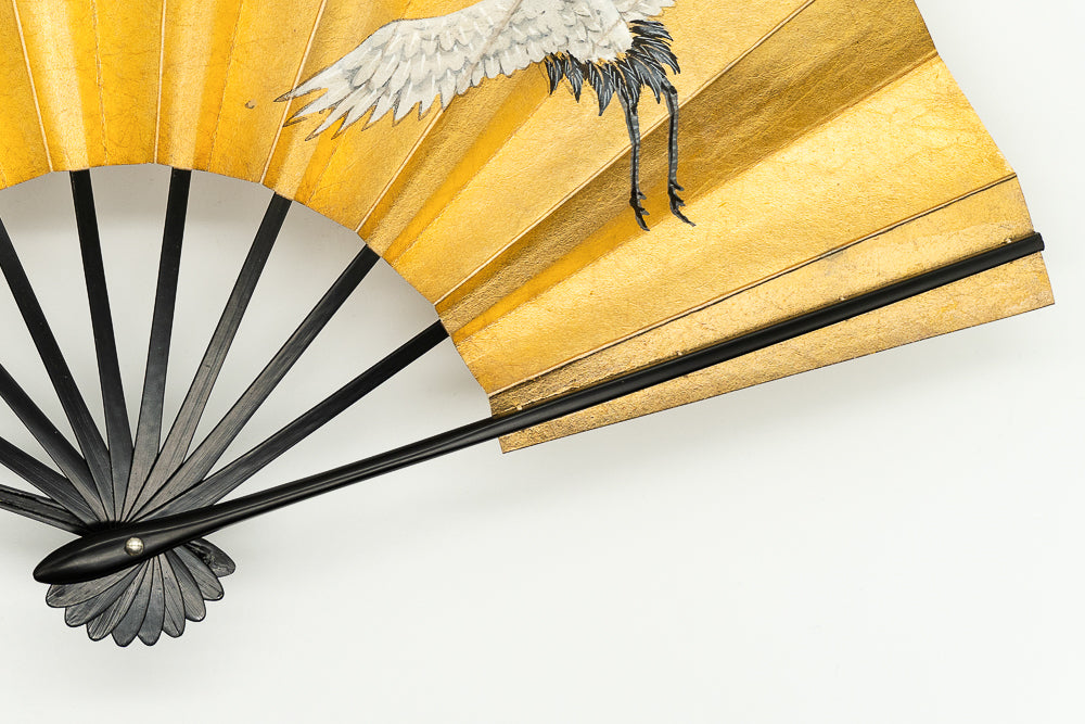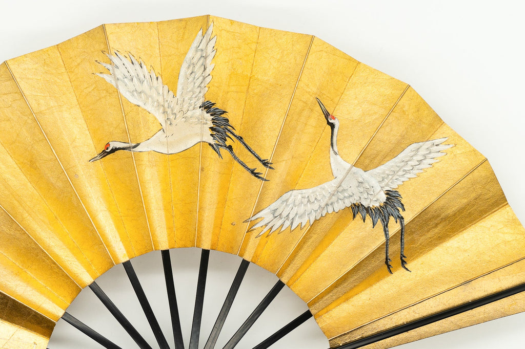 【ビンテージ品】金箔を手で揉みこんで扇面に箔押した金もみ地に手描きで夫婦鶴を丁寧に描いています。日本では鶴は生命力と長寿の象徴、つがいと一生添い遂げることから夫婦円満の象徴でもあり、古くから愛され親しまれています。