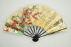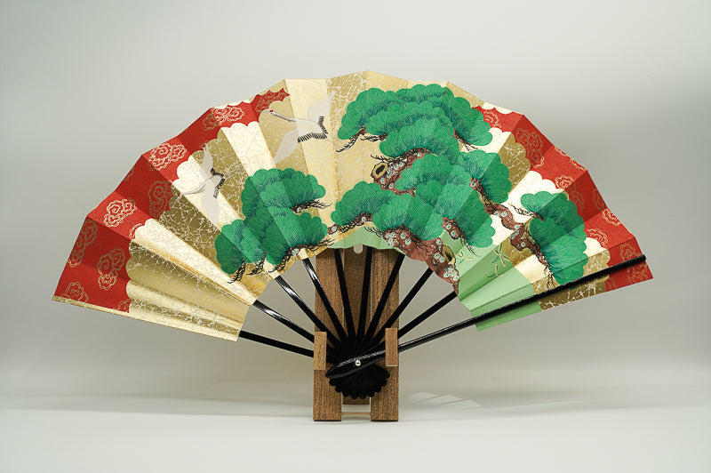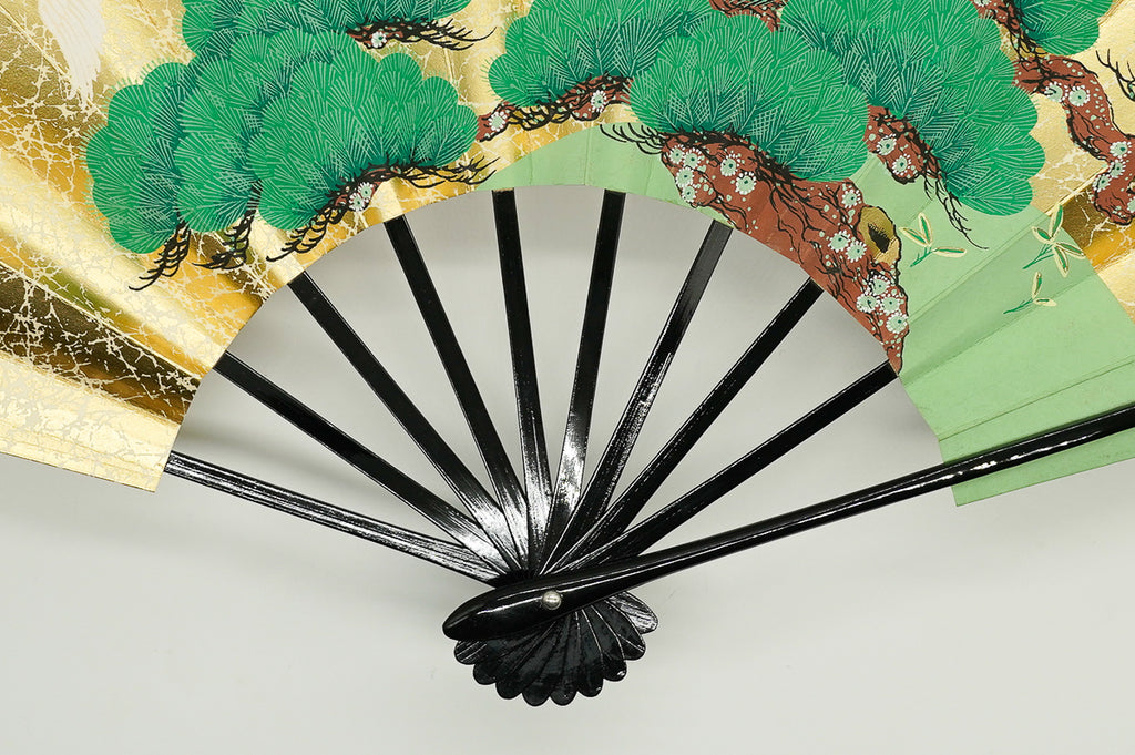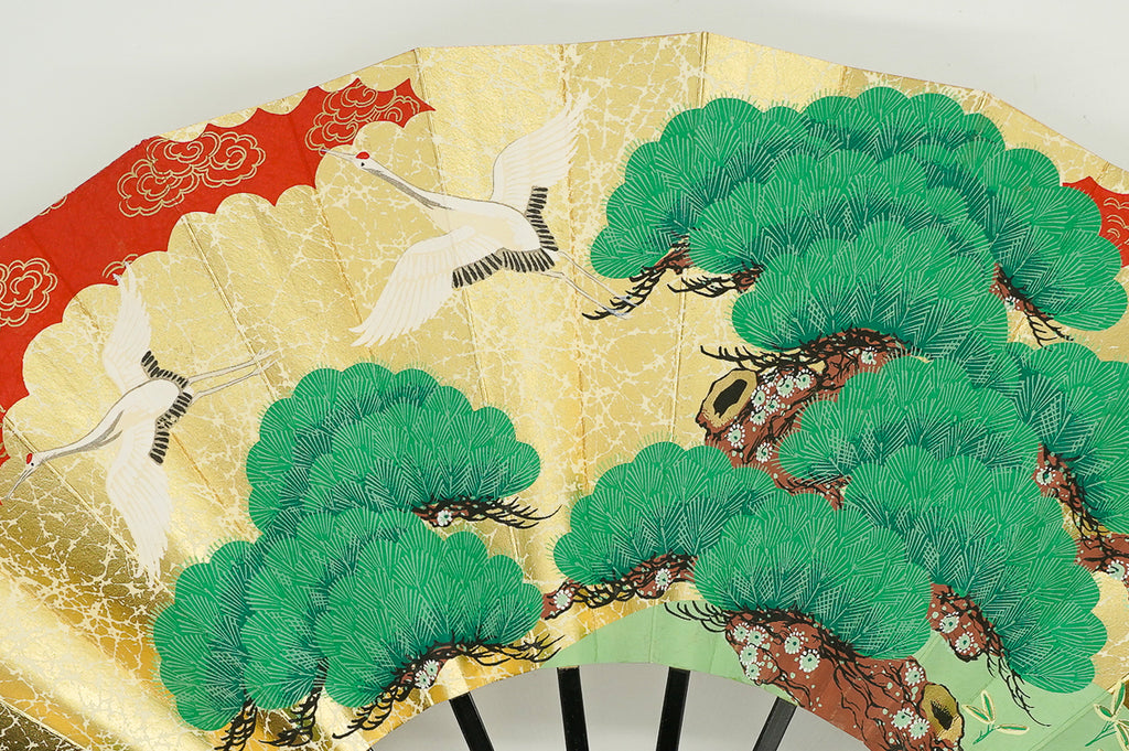 金もみ地の扇面に二羽の鶴と松、もう片面には紅白の梅が描かれています。お祝い事や贈物にもぴったりのデザインです。季節やお好みに合わせて両面お使いいただけます。