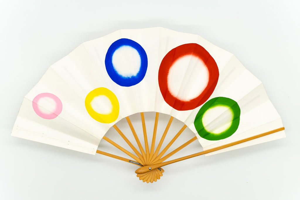 日本舞踊の演目「玉屋」で使用される絵柄です。白地に五色のシャボン玉を手描きで描いており、モダンな雰囲気も感じられます。アートとしてもお楽しみ頂ける作品です。