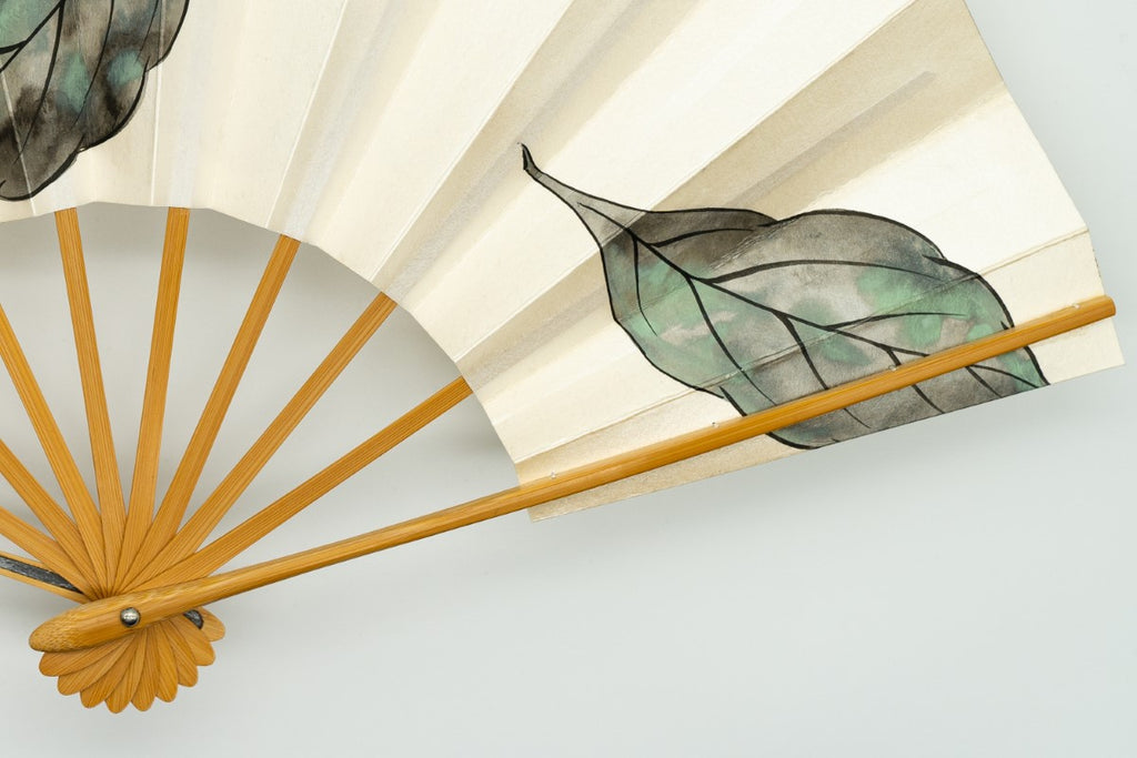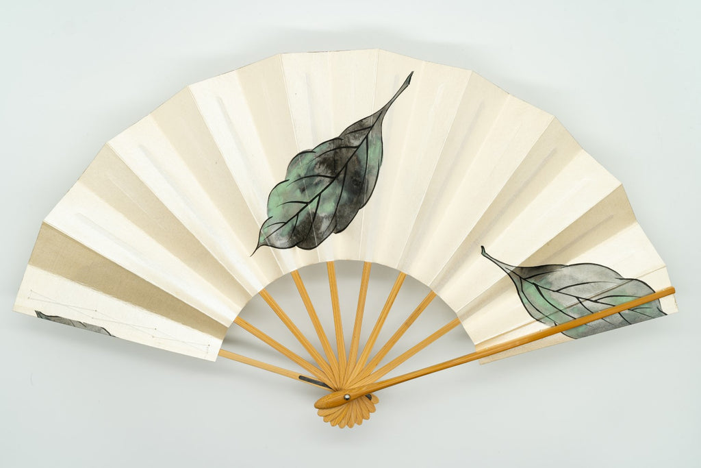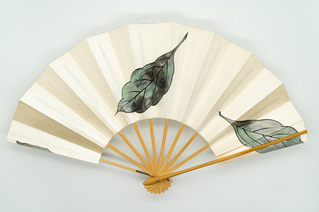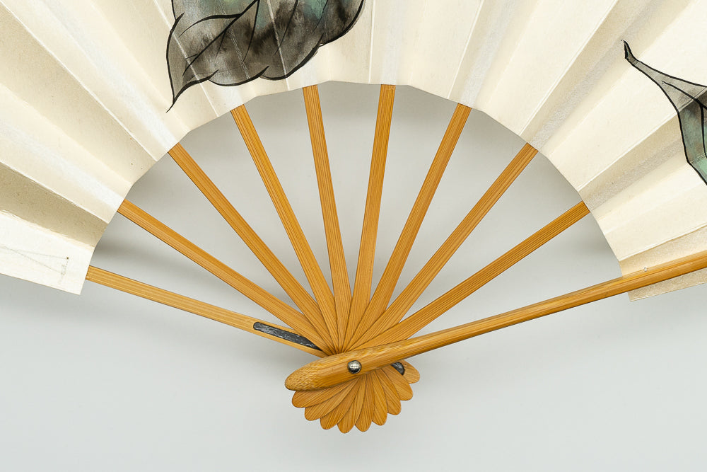 【ビンテージ】パール地の扇面にシックな色調で柏の葉が描かれています。上品な雰囲気で通年ご使用いただけます。