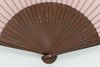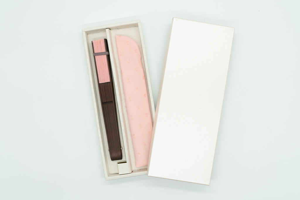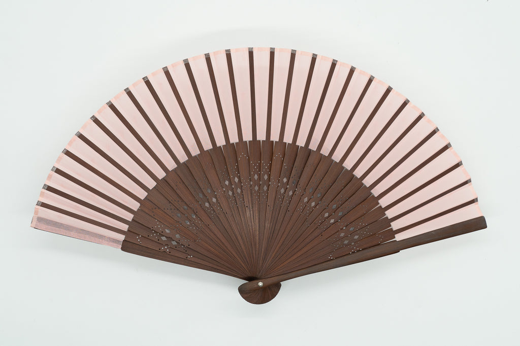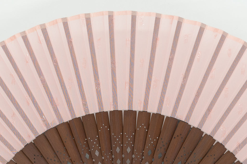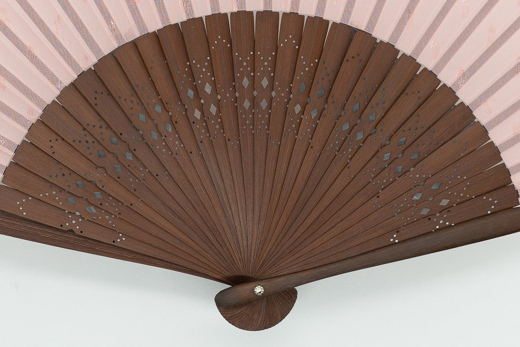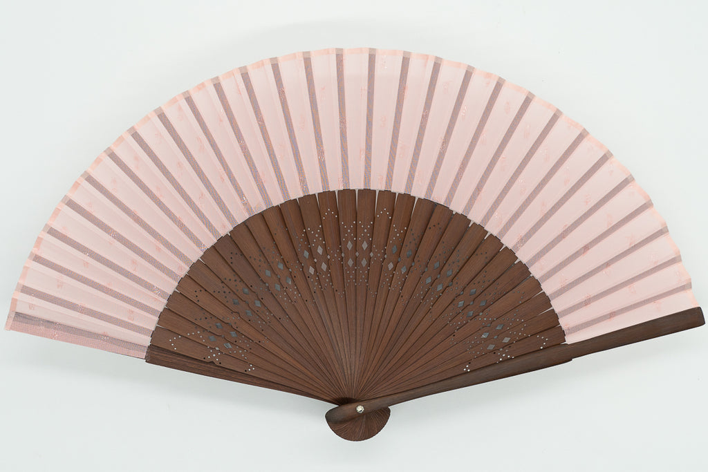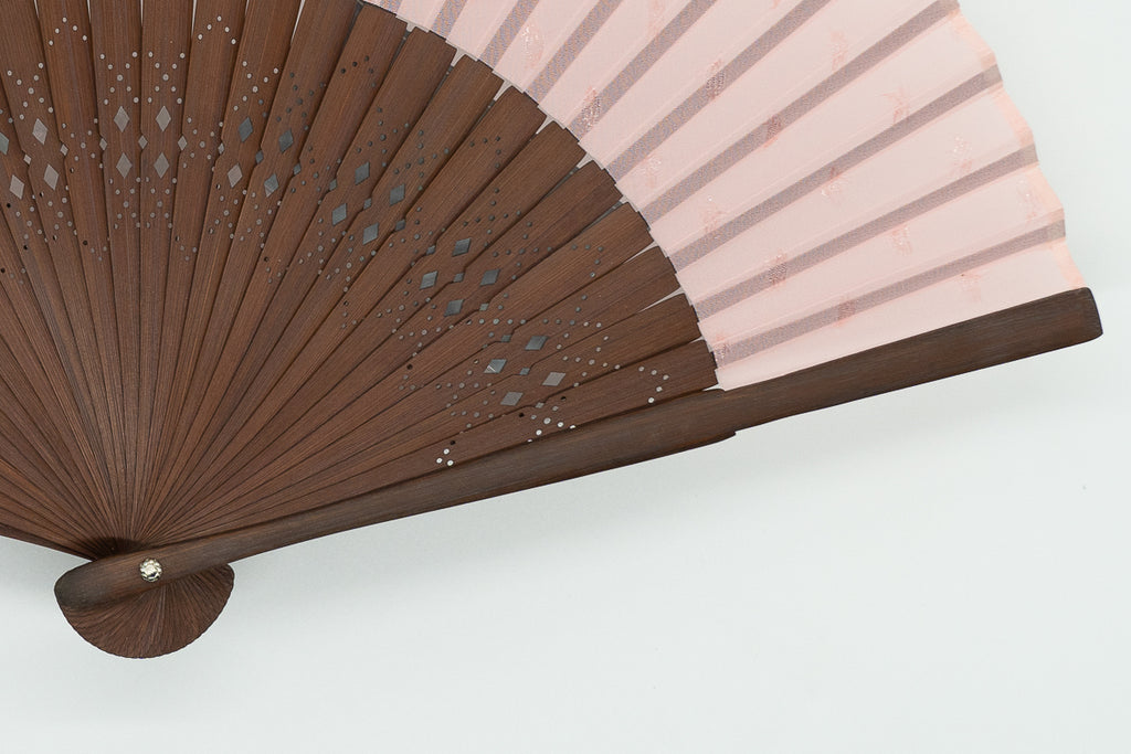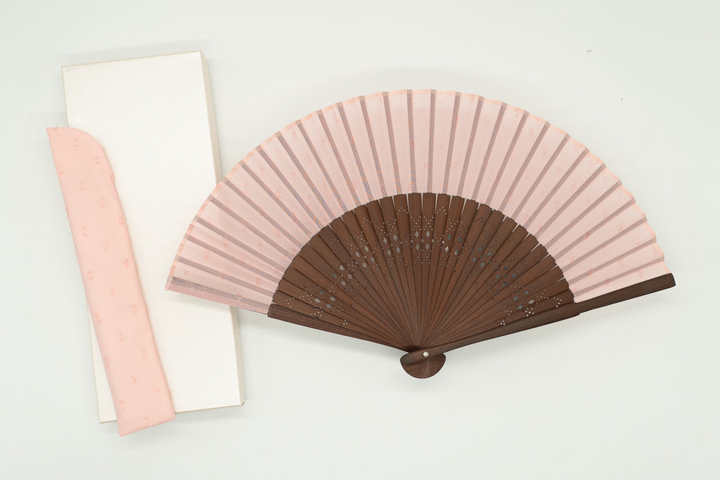 The glossy fabric with embedded film subtly shimmers, while the fan ribs feature beautifully intricate diamond-motif carvings as an accent. The accompanying fan case is made from the same fabric as the fan itself.