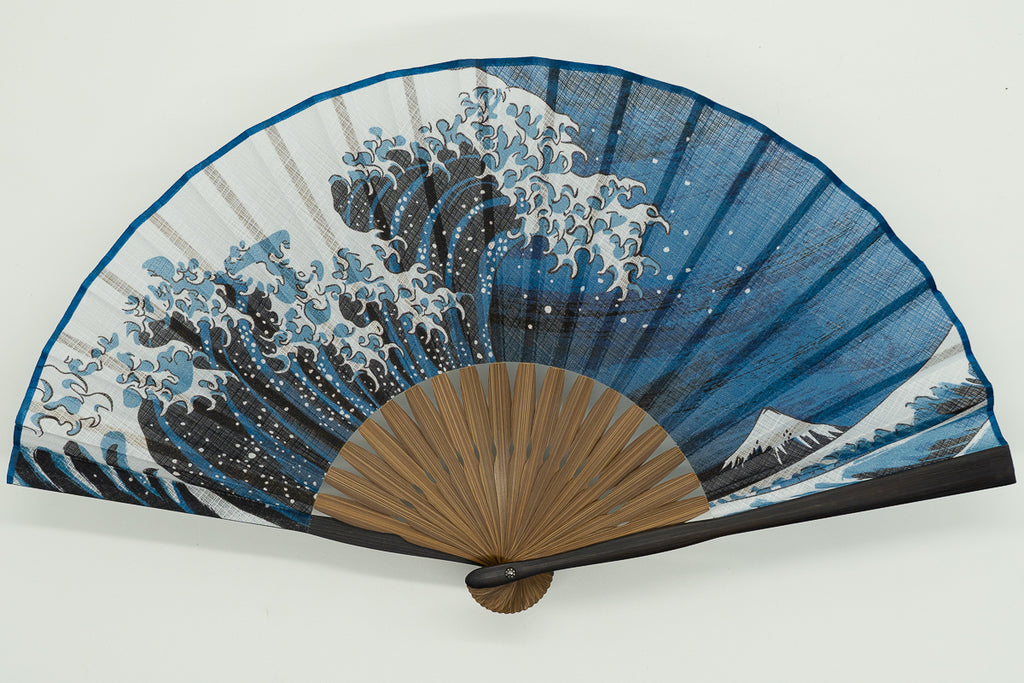 It is a world-renowned ukiyo-e print, representative of the genre, with a dynamic composition that shows high, violently swirling waves, three boats tossed by the waves, and Mount Fuji glimpsed far in the distance through the surging waves.