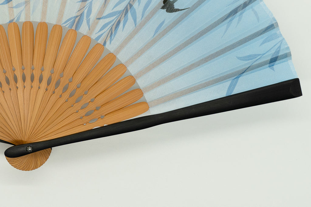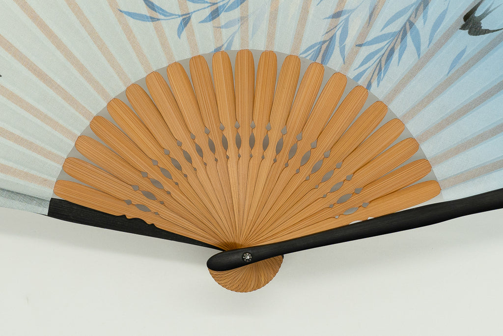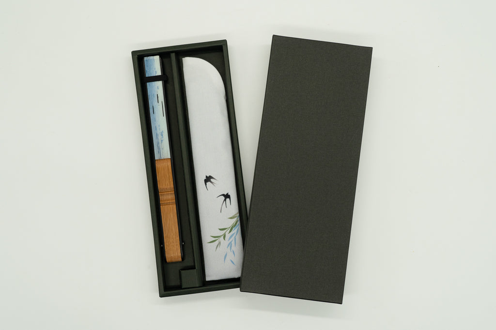 The accompanying fan case is also adorned with swallows, offering a refreshing feel for everyday use.