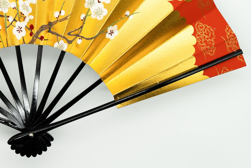 片面は金箔地に紅白梅、片面は銀箔地の扇面に舞台松が描かれています。お好みに合わせて両面お使いいただけます。お目出度い席の飾りに最適です。