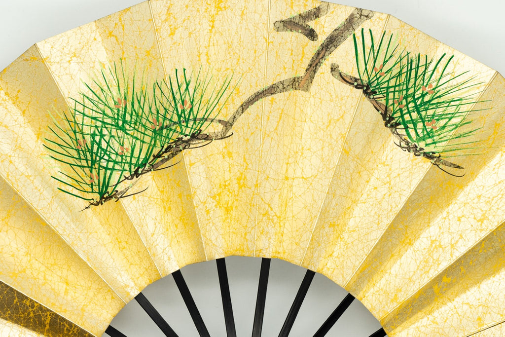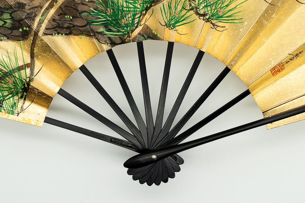 【ビンテージ】上質な金もみ地の扇面に片面には鶴と松、片面には枝松が手描きで描かれており優美な雰囲気です。お好みに合わせて両面、幅広い用途でお使いいただけます。