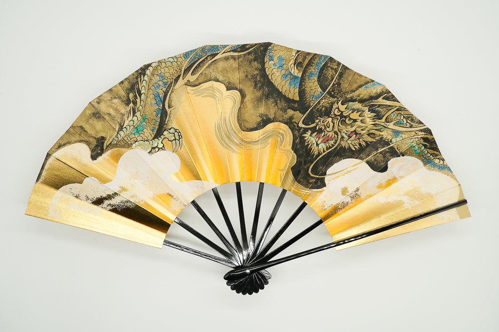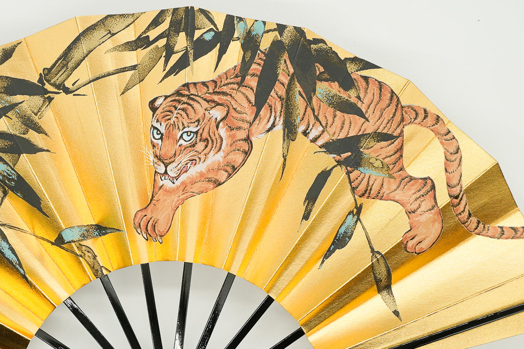 金箔地の扇面に龍、もう片面には虎が描かれています。龍虎のモチーフは外国の方にも人気があり、日本土産や贈物にもぴったりのデザインです。季節やお好みに合わせて両面お使いいただけます。